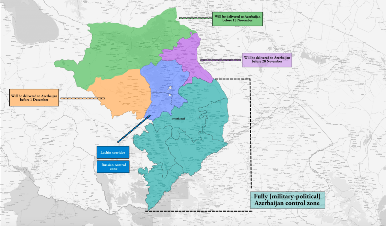 - До того, как Россия опубликовала карту своей «миротворческой операции», существовали разночтения по поводу того, какие именно районы должны быть переданы армянскими силами Азербайджану. Дело в том, что в 1992 году Баку перекроил территориальное деление своих западных территорий, а именно — увеличил Кельбаджарский район (в 1993-м занят армянскими войсками; должен быть передан Азербайджану до 15 ноября 2020-го) за счет территории автономии Нагорного Карабаха. Если следовать этому азербайджанскому административно-территориальному делению, от Карабаха по итогам войны 2020 года могло почти ничего не остаться (его карта выглядела бы примерно так). Тем не менее из карты «миротворческой операции» следует, что вывод армянских сил должен происходить по старому советскому делению.