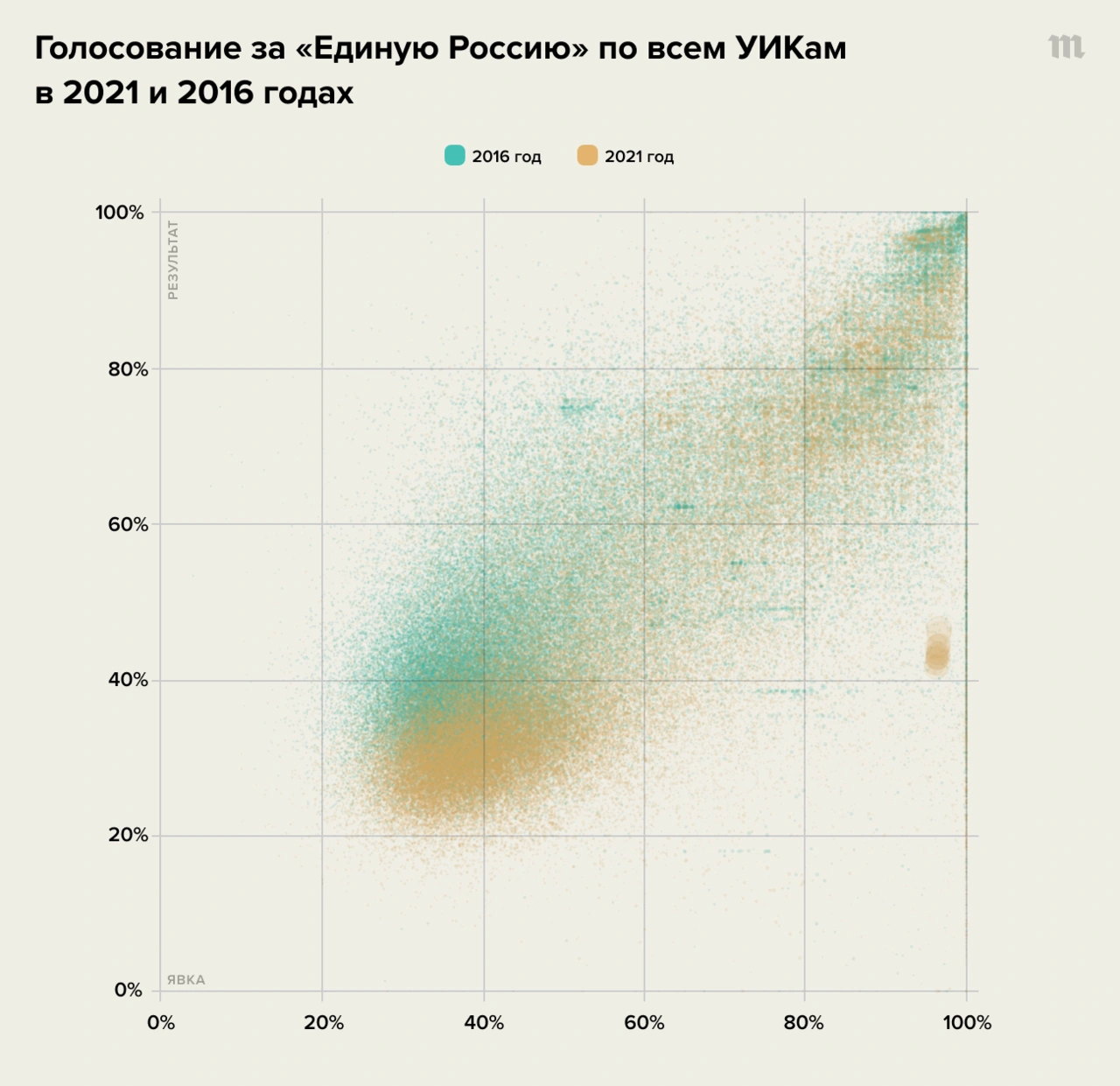 На диаграмме, составленной на основе данных ЦИК, которые собрал независимый электоральный аналитик Сергей Шпилькин, точками показаны все УИКи России. На горизонтальной оси — явка на том или ином участке. На вертикальной — процент, полученный партией. Два небольших пятна справа — это результаты московского электронного голосования.