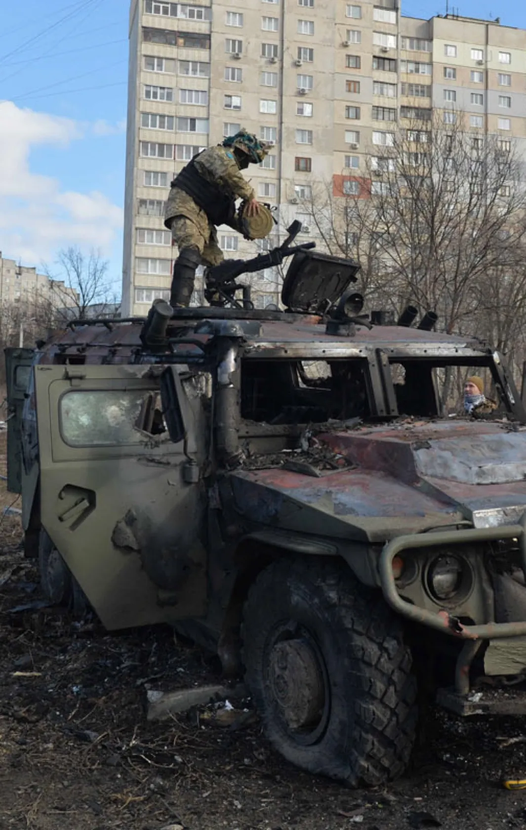 Боец территориальной обороны Украины осматривает подбитый в бою в Харькове бронеавтомобиль