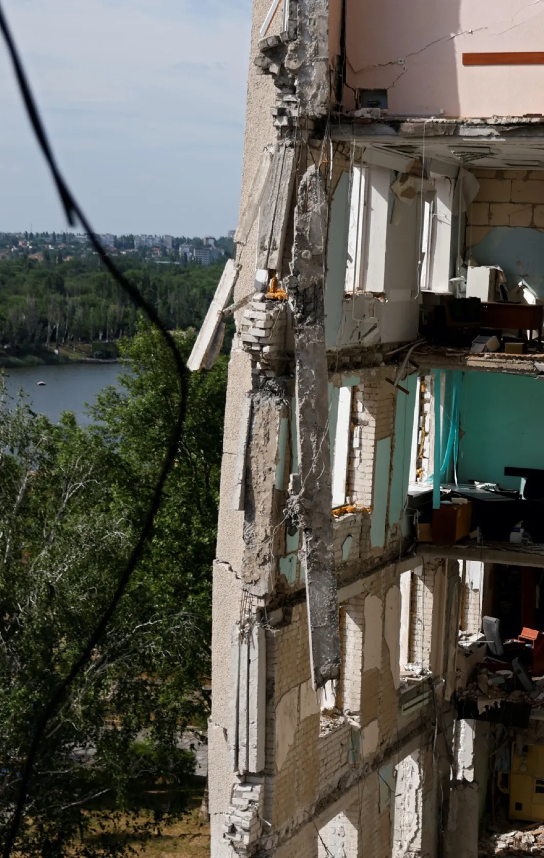 Сотрудники супермаркета, разрушенного во время российской атаки, выносят из него товары. 8 июня Харьков в очередной раз был обстрелян российскими силами, сообщали СМИ. Пострадали кафе, школьная библиотека и продовольственный магазин. Два человека погибли.