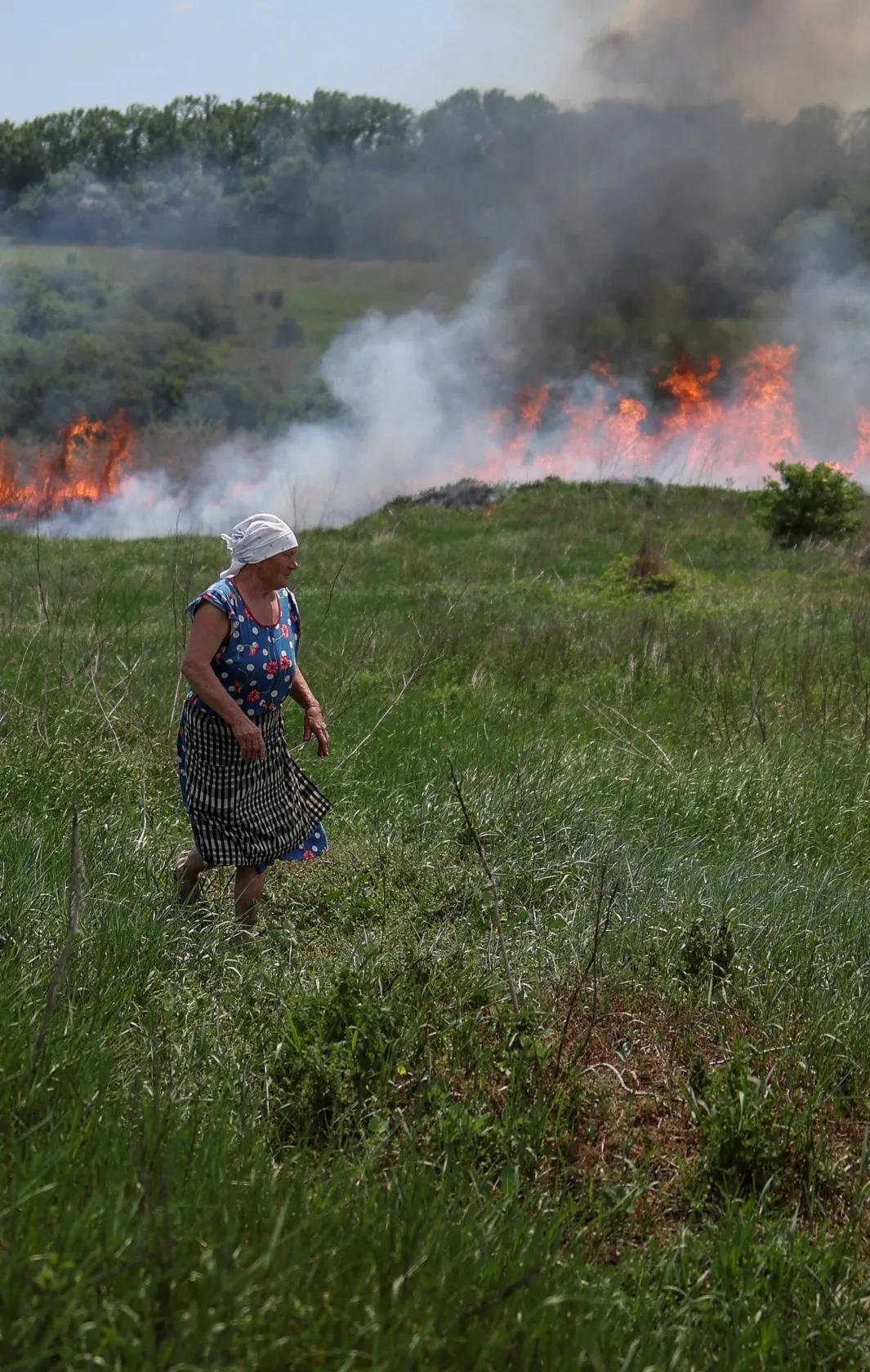 Местная жительница смотрит на траву, загоревшуюся во время артиллерийской перестрелки между украинскими военными с одной стороны и силами России и самопровозглашенных ДНР и ЛНР — с другой