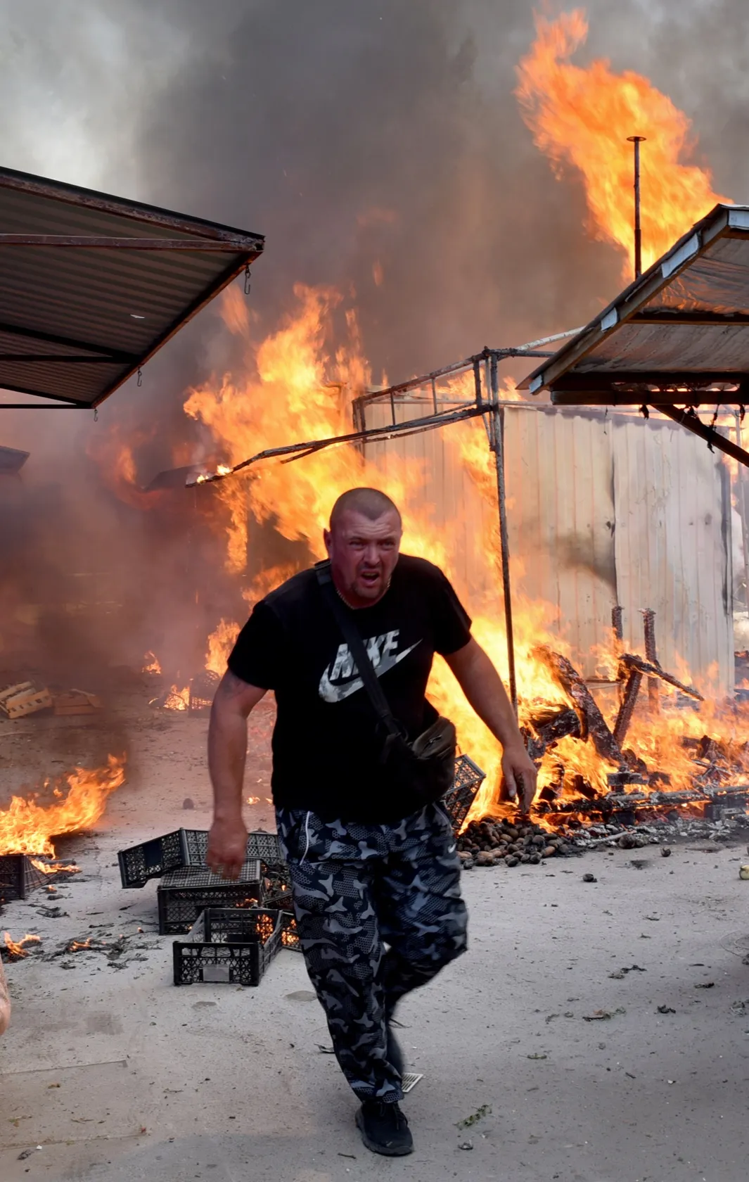 Мужчина бежит по Майскому рынку в Буденновском районе Донецка. Представители ДНР обвинили в обстреле рынка и последовавшем пожаре Вооруженные силы Украины, те пока не прокомментировали обвинения. В результате обстрела погибли по меньшей мере три человека (в том числе ребенок), четверо пострадали. По оценкам американского Института по изучению войны, основной целью российской военной кампании остается Восточная Украина — юг Харьковской, Донецкой и Луганской областей.