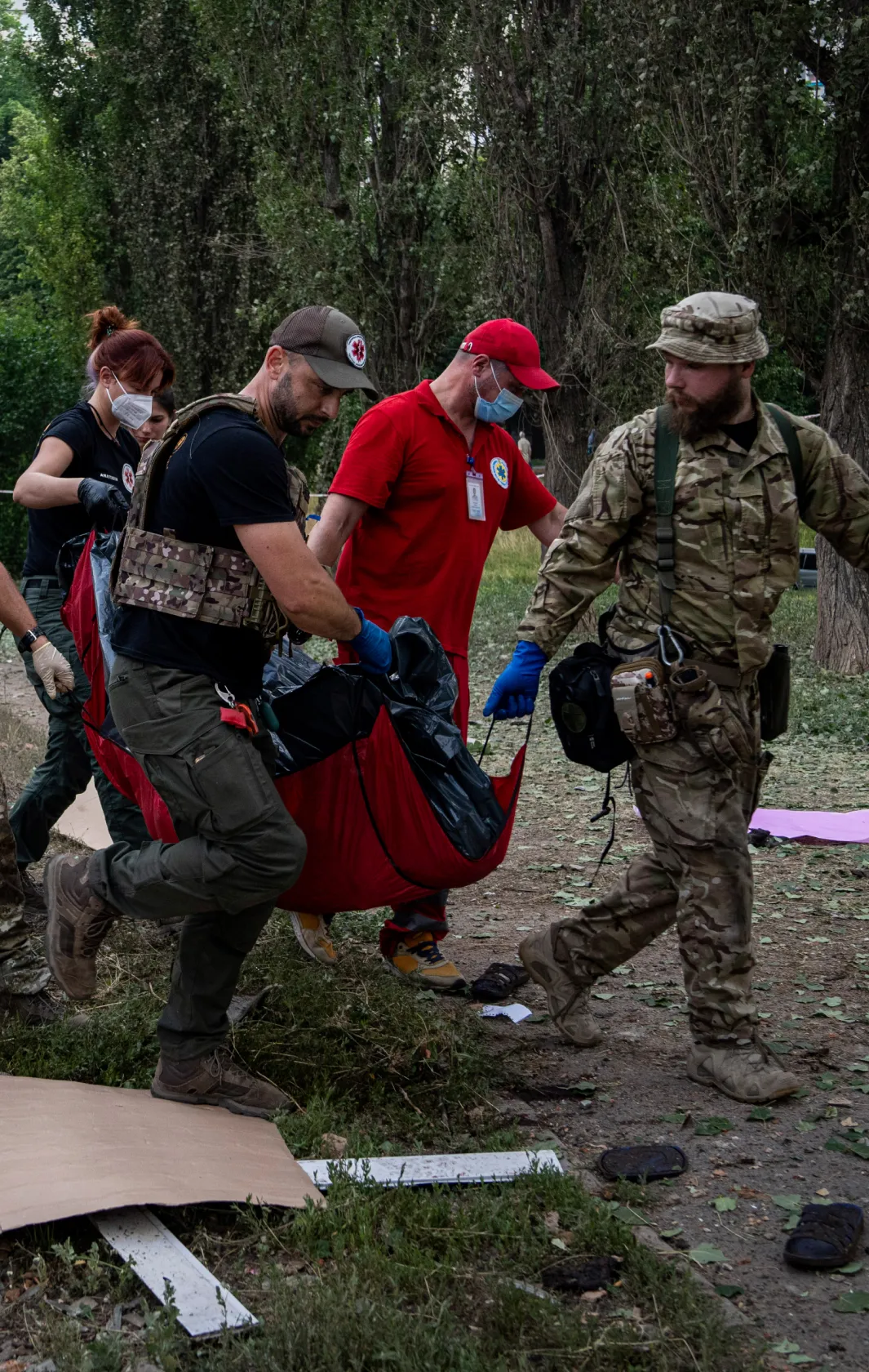 Фельдшеры переносят тело жительницы Харькова, погибшей в результате ракетного обстрела
