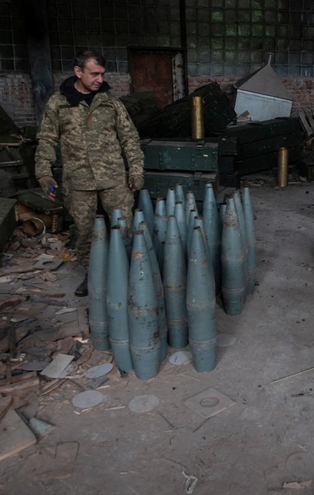 Украинский военнослужащий осматривает российские артиллерийские снаряды, захваченные во время контрнаступления недалеко от Изюма