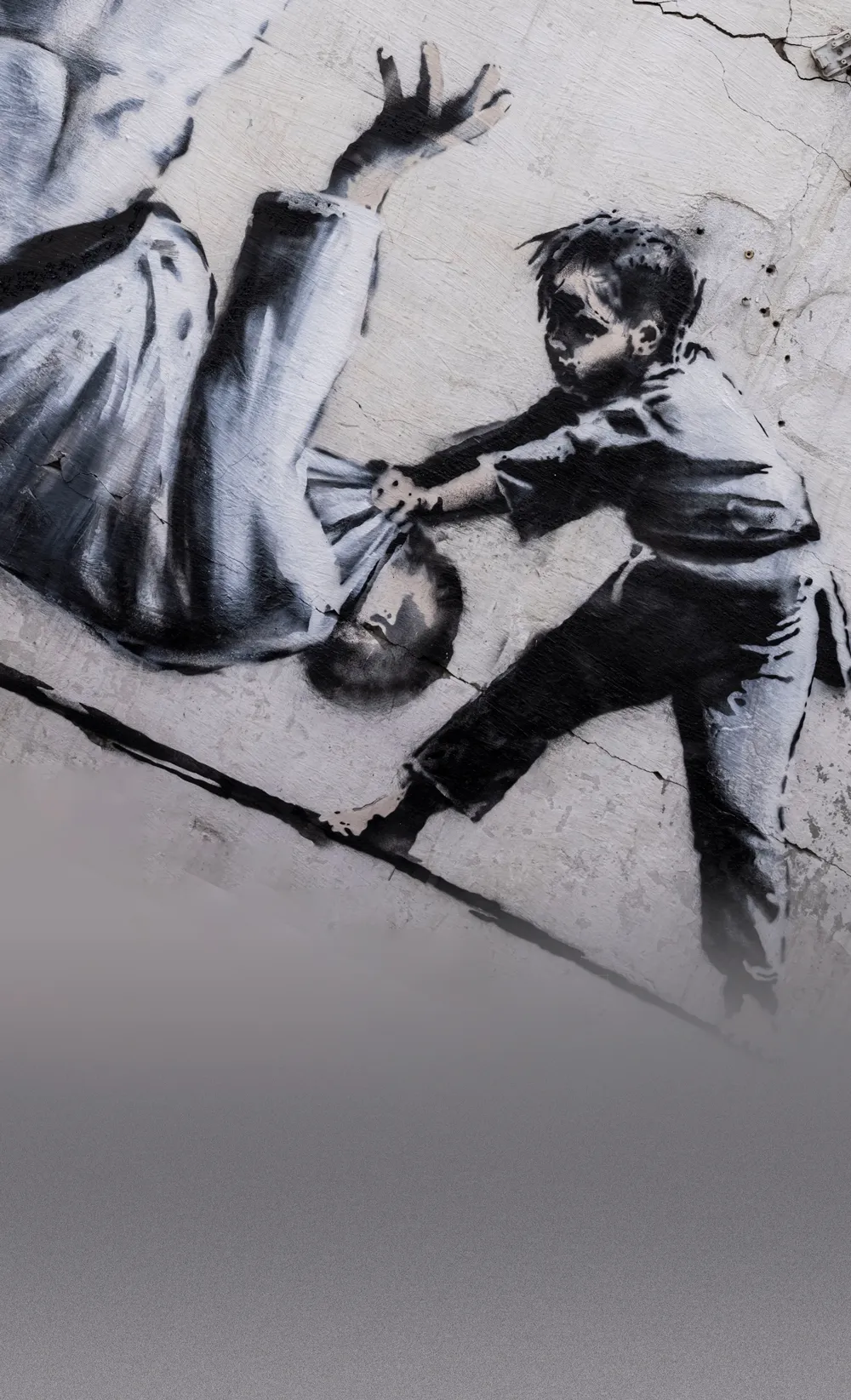 Бэнкси показал граффити из Киевской области. Но есть еще два похожих — в Бородянке и Ирпене. На одном из них мальчик побеждает дзюдоиста Двести шестьдесят первый день войны. Фотографии