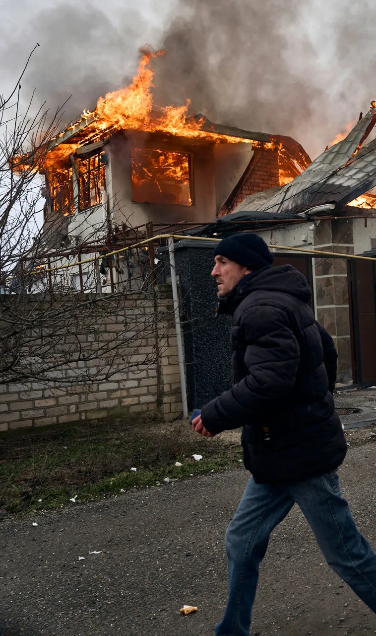Всего, по данным замглавы офиса президента Украины Кирилла Тимошенко, утром 6 января после ударов ВС РФ в Херсоне прозвучало не менее четырех взрывов. На фото — житель Херсона на фоне дома, в который попала одна из ракет