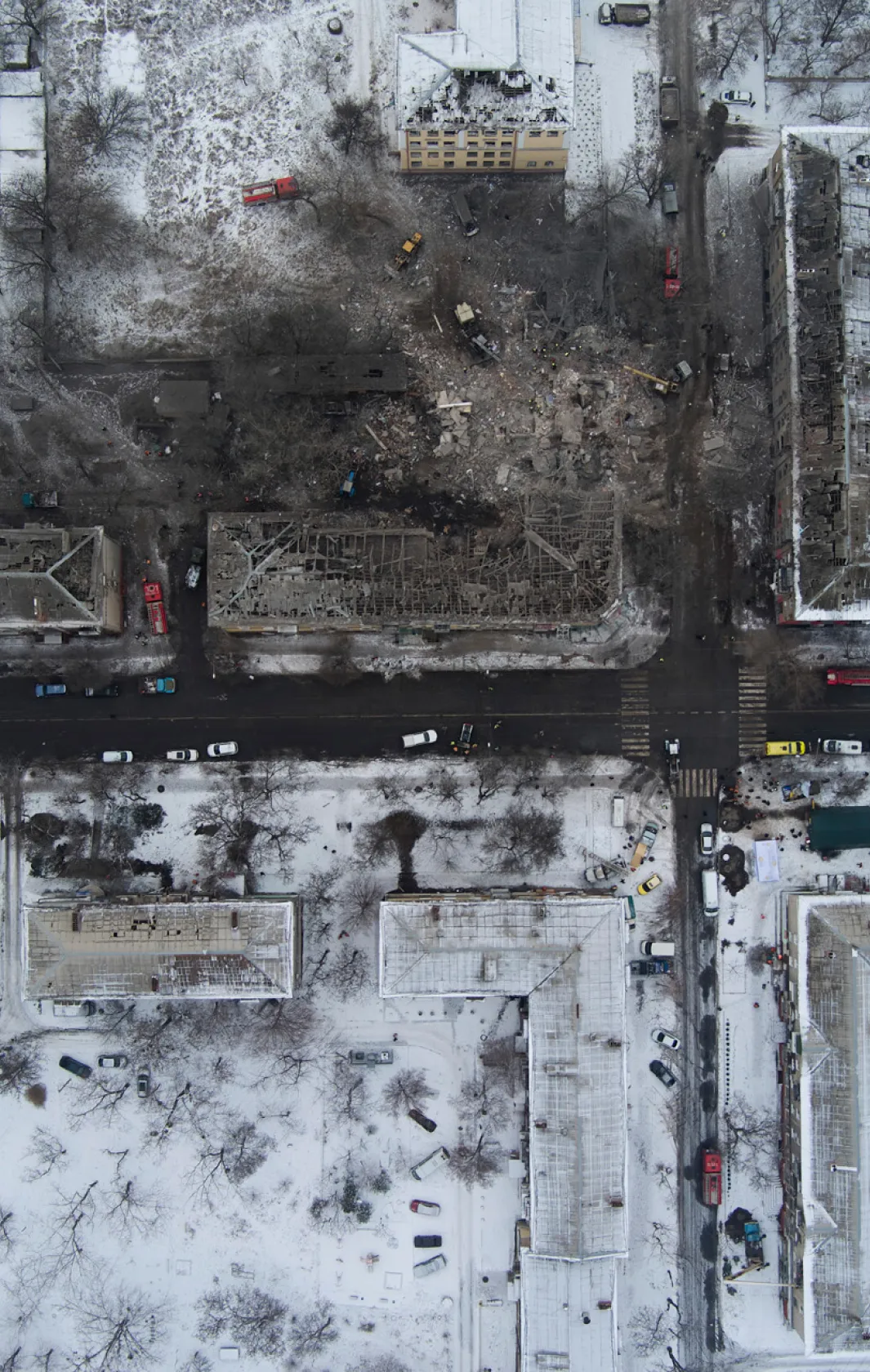 Так сейчас выглядит центр Краматорска, куда попала российская ракета. Армия РФ нанесла удар по городу вечером 1 февраля — под обстрел попал многоквартирный дом, известно о гибели пяти человек