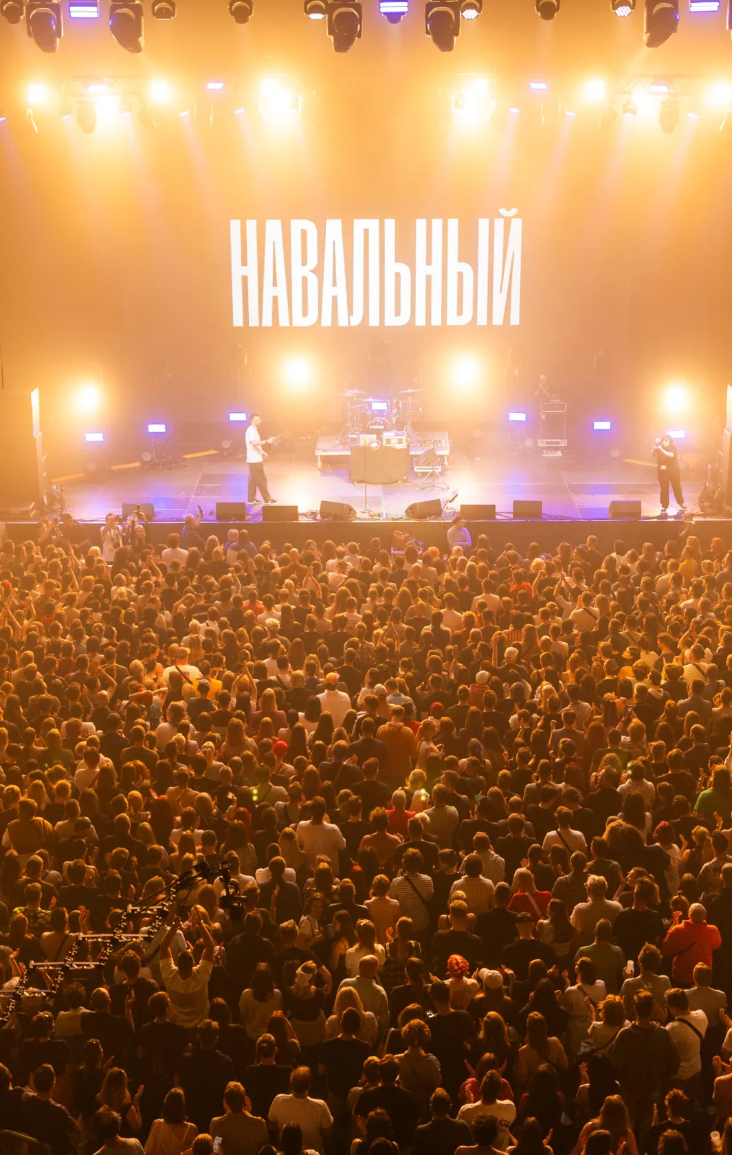 В самом зале перед началом концерта показывают видео. Вот Навальный в компании корги рассказывает о коррупционных делах теперь уже бывшего вице-премьера Игоря Шувалова. А вот выступает на митинге. А потом — в судах. Фрагменты его речей появляются на экране под бодрый бит.