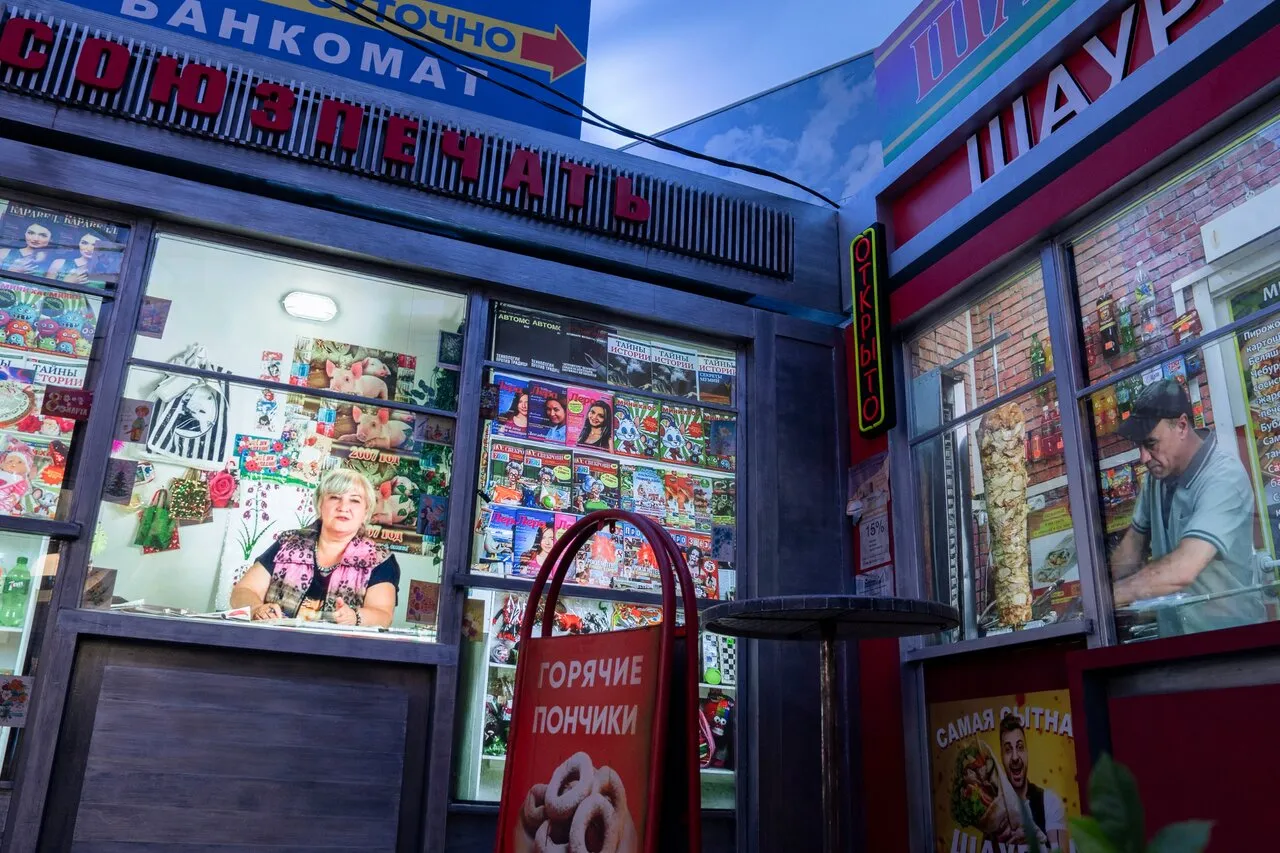 На экранах ларька Союзпечати и киоска с шаурмой актеры изображают продавцов. «Хороший шаурма, восточный!» — повторяет одна из голограмм