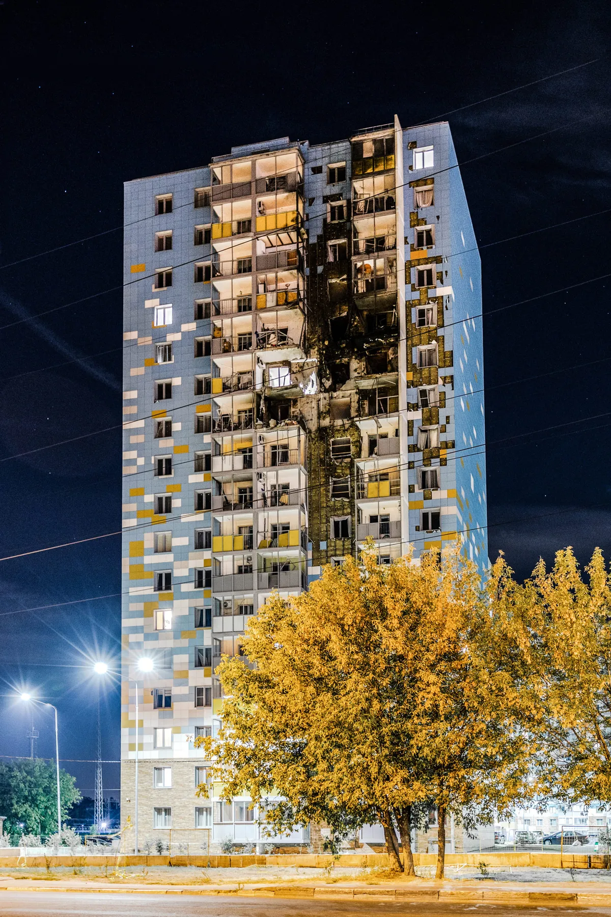 Голый по пояс пожилой мужчина курит на общем балконе многоэтажки, облокотившись о перила. Прямо напротив — изуродованная взрывом беспилотника нежно-голубая высотка с бесформенными дырами вместо оконных проемов, оплавившимися каркасами лоджий и обсыпавшейся облицовкой. Не замечать здание с того места, где курит мужчина, невозможно — но он будто специально смотрит в другую сторону.