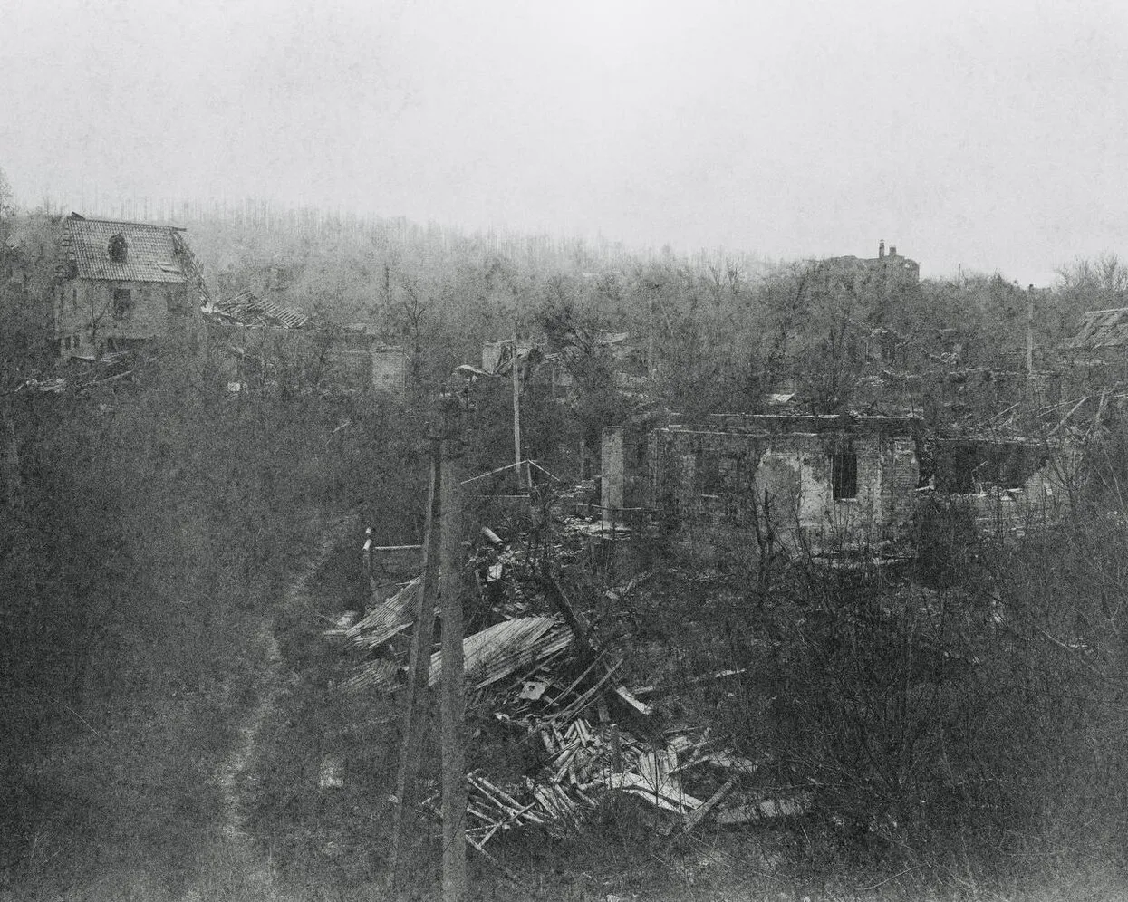 Одновременно с работой на передовой я начал снимать серию черно-белых фотографий «Vestiges in Echoes of War», посвященную мирным районам, которые пострадали от войны. В этом проекте задокументированы не сражения, а то, как война проникла в повседневность и разрушила ее слой за слоем. Фотографии отражают следы насилия, ведь оно не заканчивается после момента удара. На изображениях видны фрагменты стен, окопы, пересекающие поля, сооружения, которые когда-то относились к обычной жизни, но больше не выполняют свою изначальную функцию и стоят бесполезными, ведут в никуда.