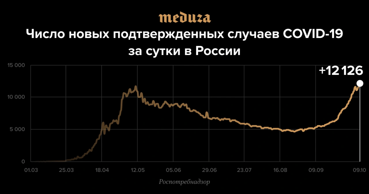 В России к утру 9 октября зарегистрированы 12 126 новых случаев коронавирусной инфекции. Это рекордный суточный прирост с начала пандемии. Ранее самое большое число заболевших было зафиксировано 11 мая — 11 656 новых случаев.