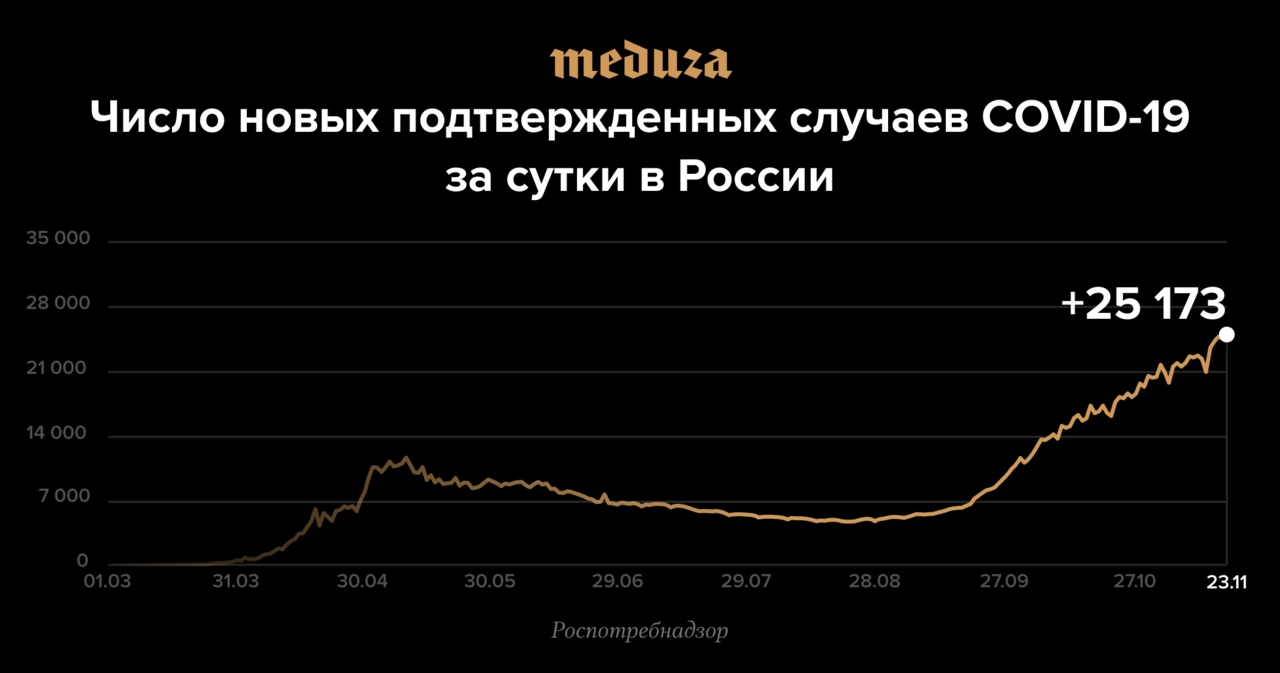 По состоянию на утро 23 ноября в России зарегистрированы 25 173 новых случая заражения коронавирусной инфекцией, сообщает оперативный штаб по борьбе с вирусом. Это новый рекорд суточного прироста заболевших с начала пандемии.