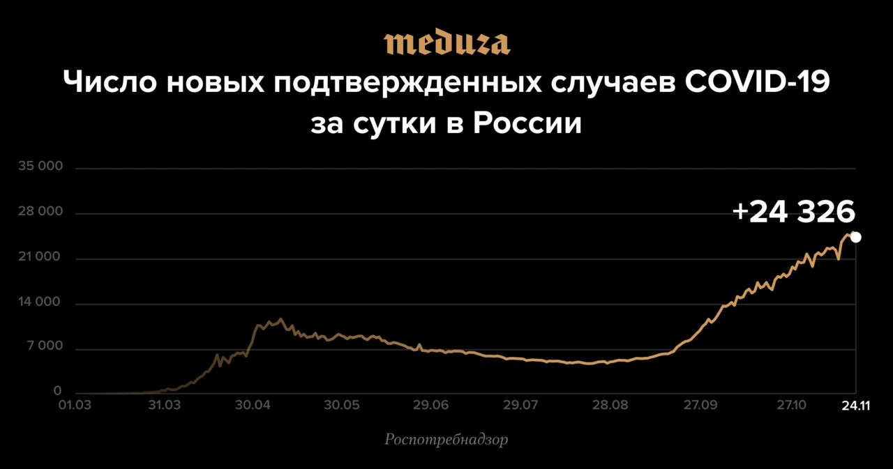 По состоянию на утро 24 ноября в России зарегистрированы 24 326 новых случаев заражения коронавирусной инфекцией. Это на 847 меньше, чем сутки ранее, когда был зафиксирован очередной рекорд суточного прироста заболевших — 25 173 случая за день.