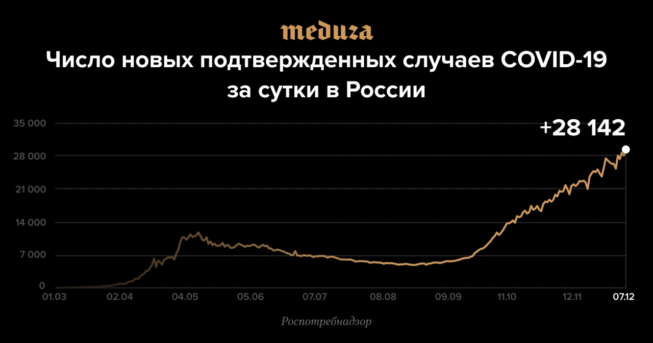В России к утру 7 декабря зарегистрированы 28 142 новых случая заболевания коронавирусной инфекцией, сообщает оперативный федеральный штаб по борьбе с вирусом. Днем ранее был зафиксирован абсолютный рекорд суточного прироста — 29 039 случаев за сутки.