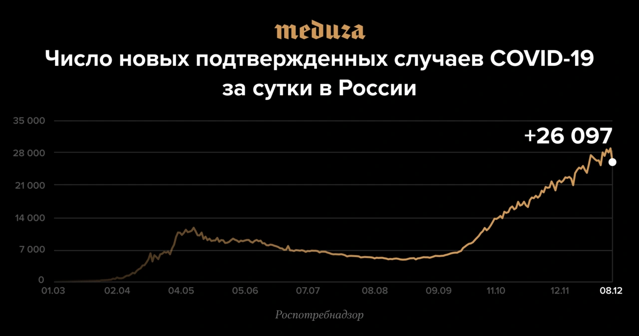 По состоянию на 11:10 8 декабря в России зарегистрировали еще 26 097 случаев заболевания коронавирусной инфекцией, сообщил оперативный штаб по борьбе с распространением вируса. Днем ранее в России выявили 28 142 новых случая заболевания.