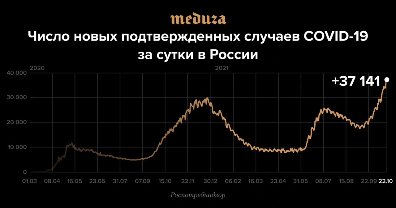 По данным федерального оперативного штаба по борьбе с COVID-19 на утро 22 октября, за прошедшие сутки выявлен 37 141 новый случай заболевания ковидом. Это максимум с начала пандемии.