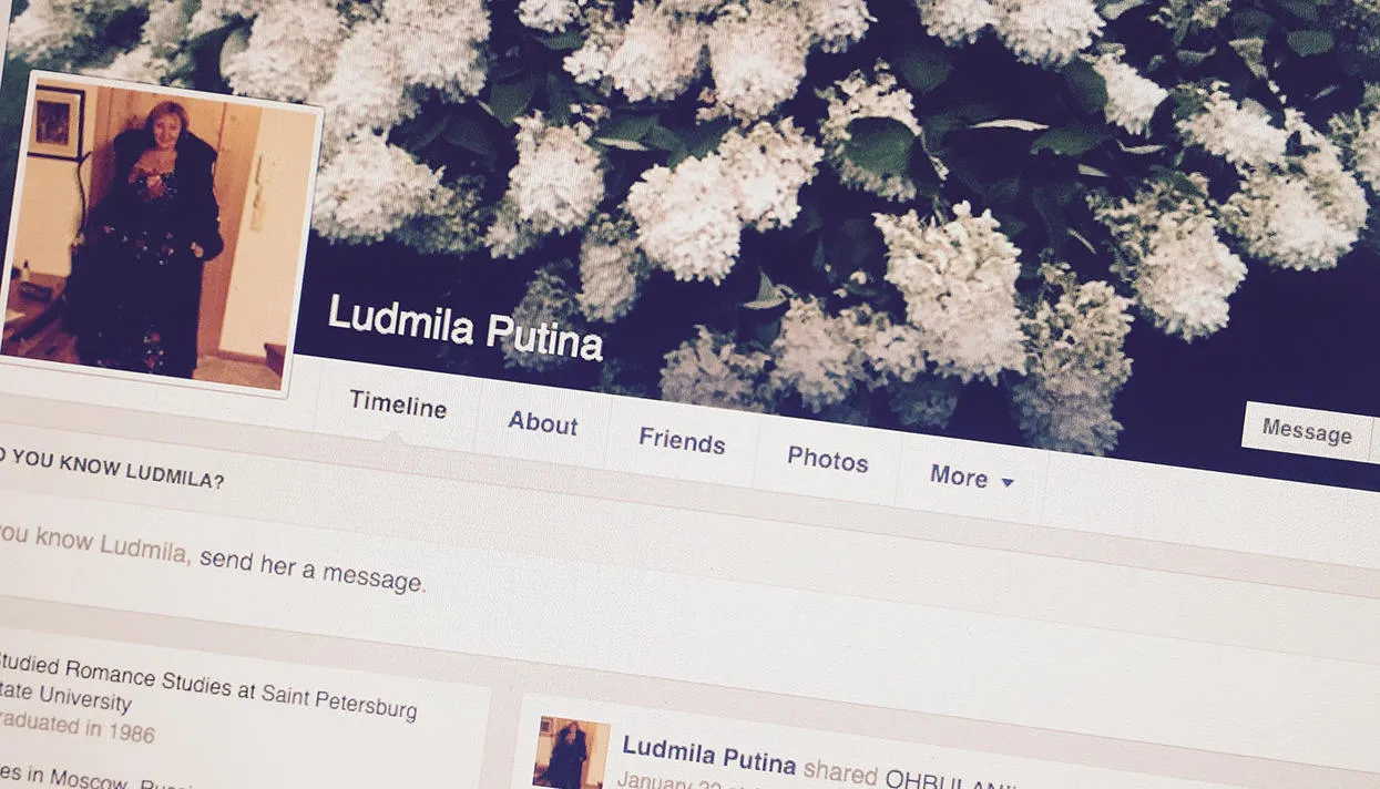 Через несколько дней интернет-пользователи обнаружили фейсбук Артура Очеретного, а в друзьях у него — «Людмилу Путину». Не факт, что этот аккаунт, существующий как минимум с 2012 года, то есть еще до развода, действительно ведет Людмила Путина, но почему бы и нет? Его содержание не выглядит чьей-то дурацкой шуткой — напротив, страница получилась очень доброй. С книгами, музыкой, кошками и собаками.