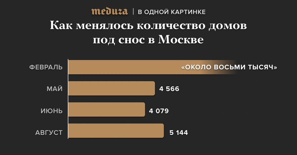 1 августа московская мэрия подвела окончательные итоги голосования по программе массового сноса домов, в список вошли 5144. Чтобы его составить, мэрия сначала провела голосование квартир по своему списку, а затем разрешила всем желающим добавить дома в программу на собрании собственников жилья. При этом в феврале, когда программа только утверждалась в Кремле, речь шла почти о восьми тысячах домов.