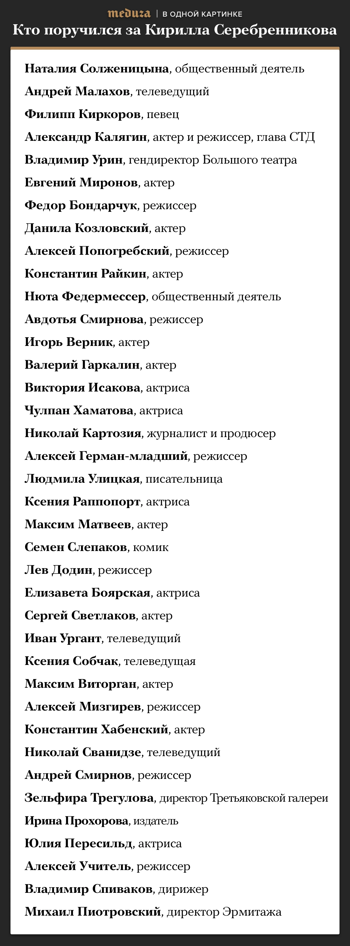 За Кирилла Серебренникова поручились 38 человек. Список