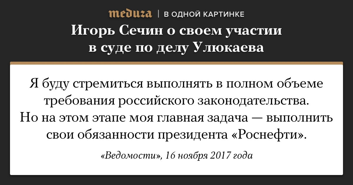 Глава «Роснефти» Игорь Сечин объяснил, почему он ни разу не пришел в суд по делу Алексея Улюкаева, хотя его вызывали три раза. По словам Сечина, его главная задача — руководить «Роснефтью», и только потом ходить в суд. Он пообещал прийти, как только удастся «согласовать необходимые графики». Как уверяет следствие, именно у Сечина Улюкаев вымогал взятку.