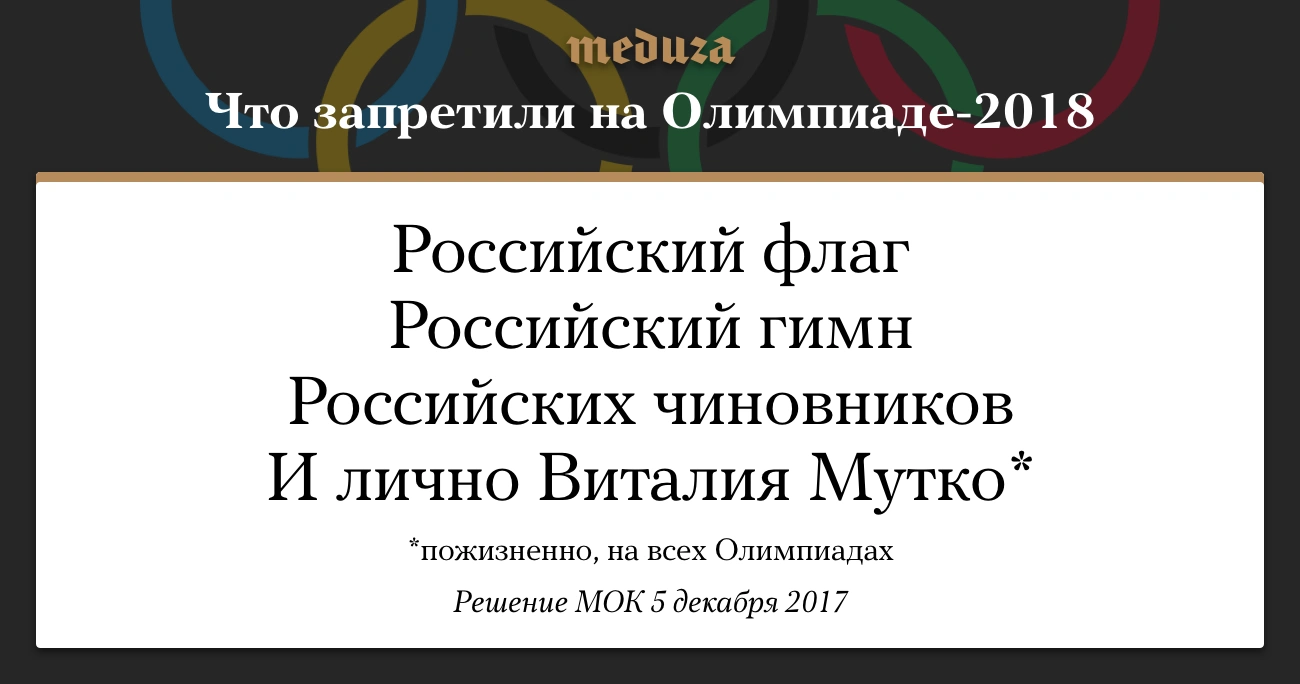 5 декабря Международный олимпийский комитет решил, что Россия не может участвовать в Играх в Пхенчхане в 2018 году. Российские спортсмены смогут соревноваться только под нейтральным флагом. Персональные санкции введены против бывшего министра спорта, вице-премьера Виталия Мутко, которого отстранили от Олимпийских игр пожизненно.