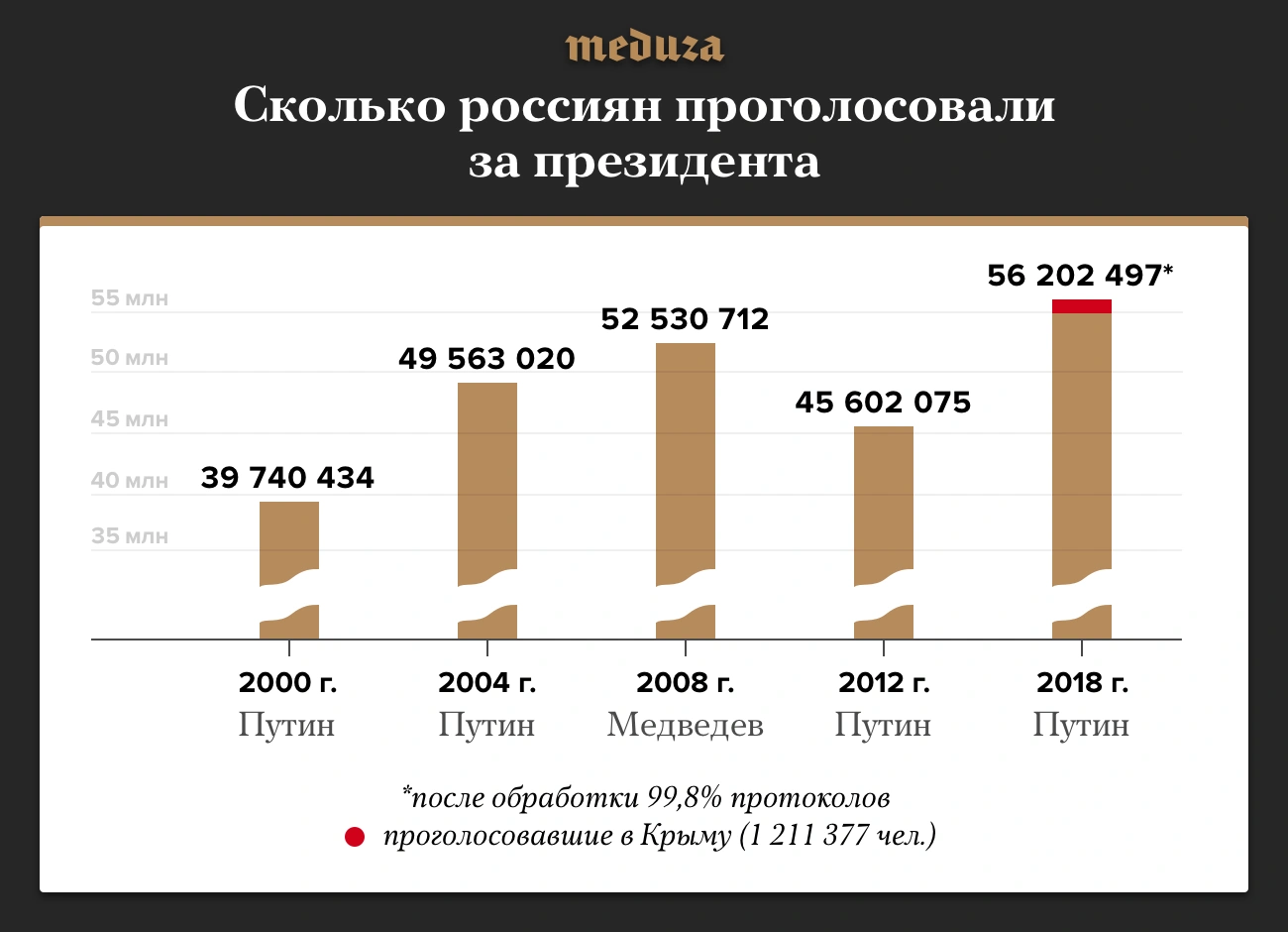 На выборах президента 18 марта Владимир Путин установил исторический рекорд по количеству голосов избирателей. Он впервые опередил по этому показателю Дмитрия Медведева, выигравшего выборы в 2008 году. За Путина проголосовали более 56 миллионов — это свыше половины всех россиян, которые могут голосовать. Более миллиона проголосовавших — крымчане.