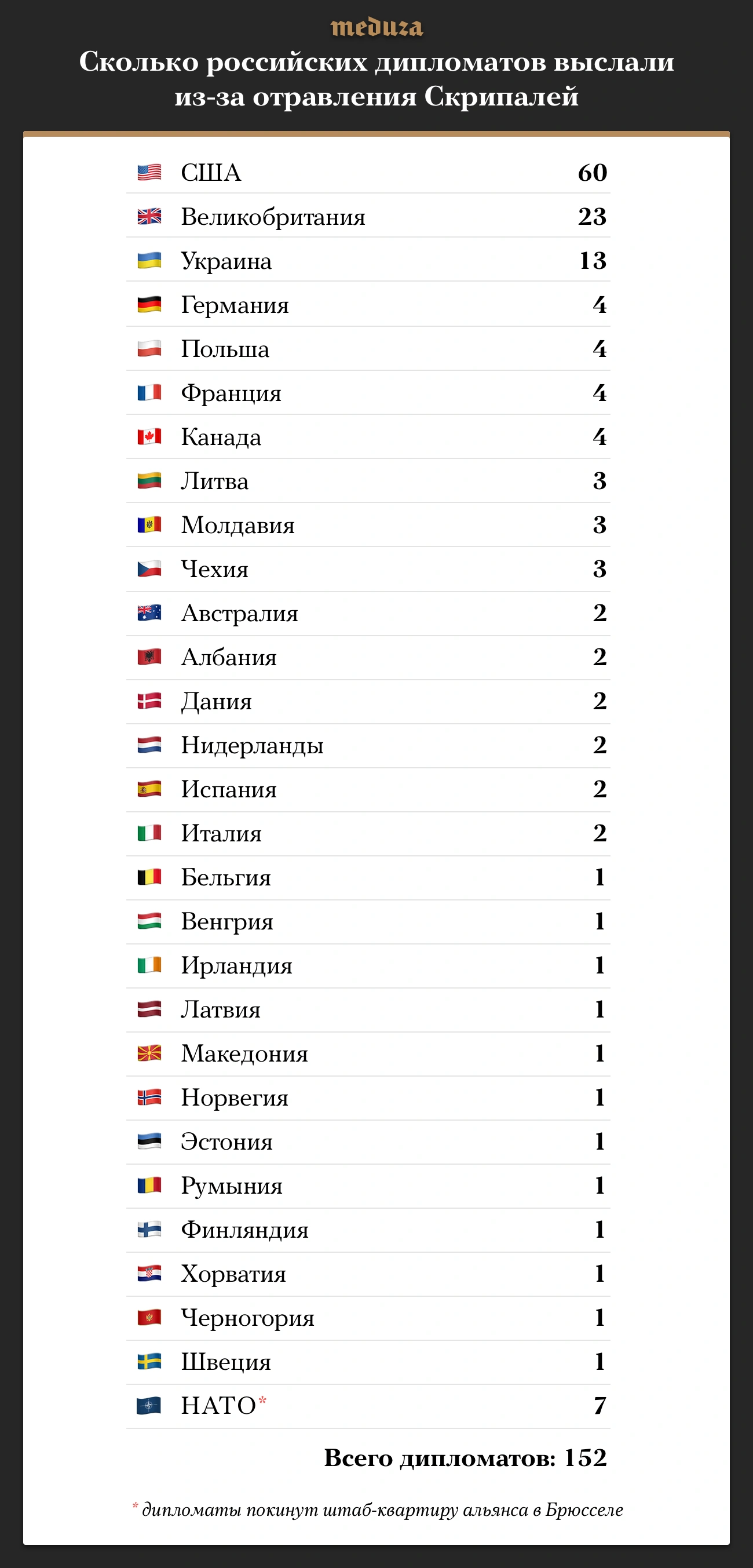 26 марта США, Канада и европейские страны объявили о высылке российских дипломатов в связи с отравлением Сергея и Юлии Скрипаль в британском Солсбери. В США заявили, что поддерживают Великобританию — своего союзника по НАТО, на территории которого было применено боевое отравляющее вещество. Россия уже пообещала принять ответные меры против стран, которые выслали дипломатов.