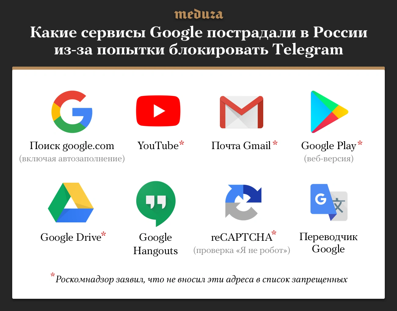 23 апреля российские пользователи столкнулись с масштабными сбоями в работе почти всех сервисов Google — от основного поиска до reCAPTCHA, который отличает человека от робота. Это произошло после того, как Роскомнадзор добавил в список запрещенных IP-адреса основной страницы Google (в реестре 118 таких адресов). После массовых жалоб на проблемы с доступом к сервисам в Роскомнадзоре заявили, что не вносили их адреса в реестр запрещенных сайтов. Проблемы с доступом к Google.ru в ведомстве связали с низким качеством систем фильтрации трафика у провайдеров.