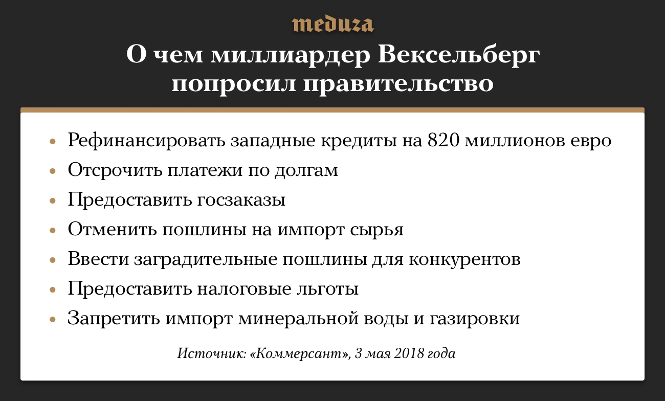 Группа «Ренова» миллиардера Виктора Вексельберга, попавшего под санкции США, предложила правительству план поддержки компаний, входящих в группу. Газета «Коммерсант» сообщает, что список получился «максимально широким». В него вошел даже запрет импорта напитков для поддержки холдинга «Байкал».