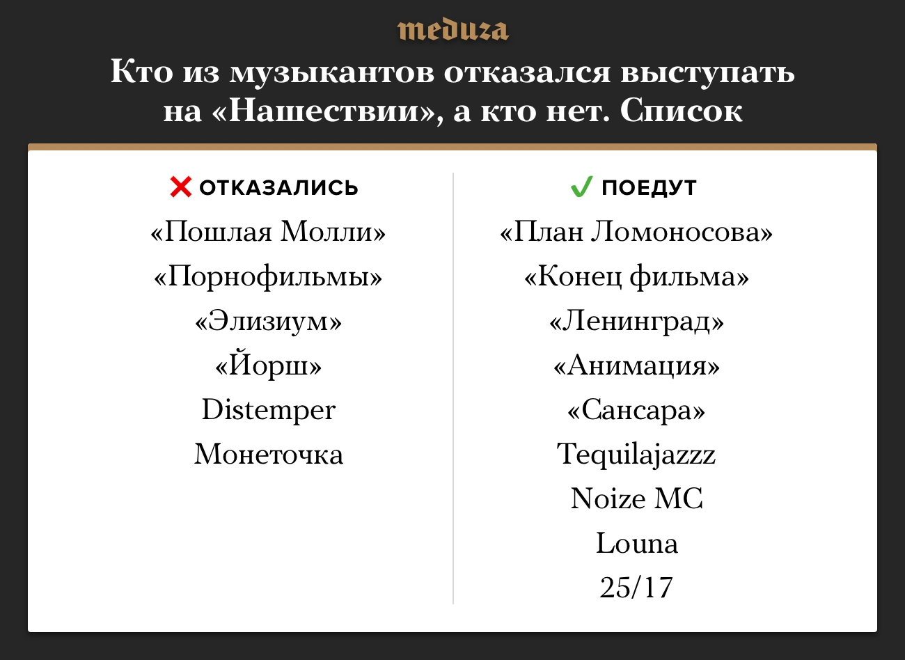 Кто из музыкантов отказался выступать на «Нашествии», а кто нет. В одной картинке
