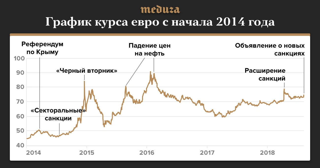 Курс евро в России в августе 2018 года поднялся выше 76 рублей. Это произошло на фоне новостей об ужесточении санкций против России со стороны США. Предыдущий скачок курса евро был также связан с расширением санкций.