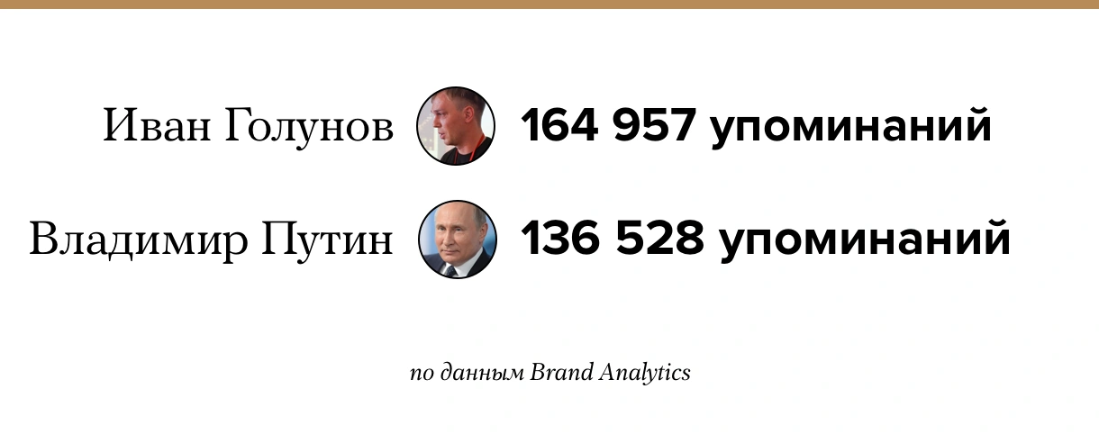 8 июня в день суда по мере пресечения корреспонденту «Медузы» Ивану Голунову он стал самой упоминаемой персоной в российских соцсетях. Об этом свидетельствуют данные сервиса «Медиатренды» компании Brand Analytics. По упоминанию в СМИ Голунов (5 032 материала) лишь ненамного отстал от Путина (5 623).