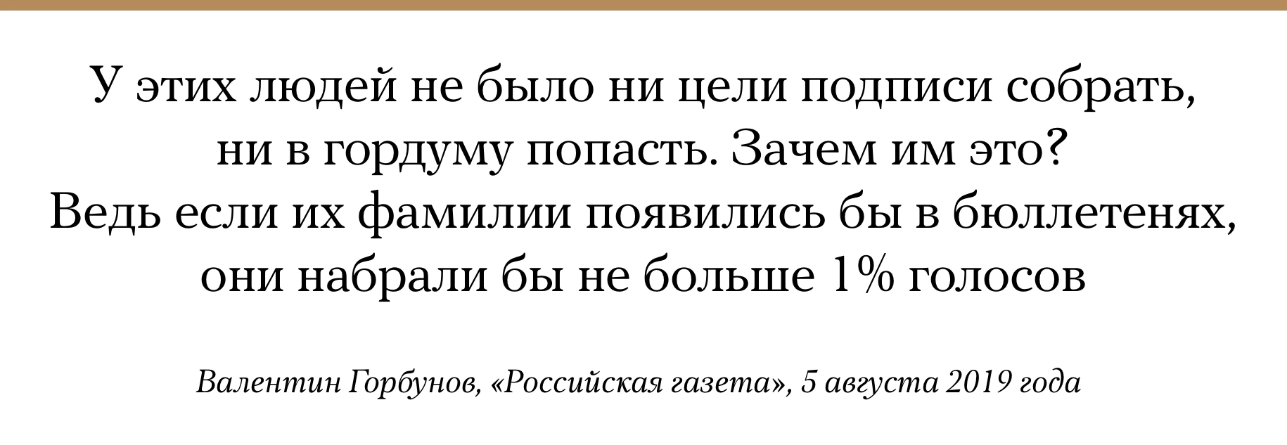 Глава Мосгоризбиркома Валентин Горбунов считает, что оппозиция использует нынешние выборы в Мосгордуму «как способ обкатки технологий» к выборам в Госдуму 2021 года. «Это своеобразная репетиция борьбы за отмену сбора подписей», — заявил он в интервью «Российской газете». По его словам, при подготовке подписей оппозиционеры пустили в ход «очень широкий спектр грубых подделок». Независимые кандидаты в депутаты Мосгордумы с середины июля проводят акции протеста в Москве за допуск к выборам, утверждая, что их не регистрируют по политическим причинам. 20 июля на согласованном митинге за допуск кандидатов собрались более 20 тысяч человек. 27 июля и 3 августа полиция разогнала несанкционированные акции протеста в Москве, задержав в каждый из дней более тысячи человек.