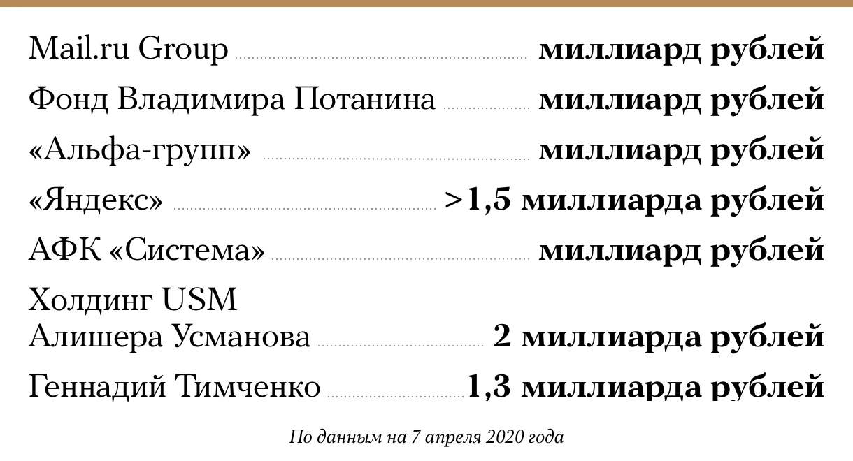 Российские бизнесмены пообещали выделить деньги на борьбу с кризисом, возникшим из-за пандемии коронавирусной инфекции. Компания Mail.ru Group объявила о программе поддержки малого и среднего бизнеса, Фонд Владимира Потанина направит деньги некоммерческим организациям, а «Альфа-групп» сделает пожертвование на неотложные меры правительства и «поддержку тех, кто сегодня больше всего нуждается в помощи». Компания «Яндекс» выделила более 1,5 миллиарда рублей на программу помощи людям во время эпидемии, в том числе направила 250 миллионов рублей на оплату части поездок для социальных и медицинских служб. АФК «Система» сообщила, что вложила «порядка миллиарда рублей» на борьбу с эпидемией. Холдинг USM Алишера Усманова объявил, что направит 2 миллиарда рублей на нужды оперативного штаба по борьбе с коронавирусом. Миллиардер и владелец инвестиционной группы «Волга Груп» Геннадий Тимченко выделил больше 1,3 миллиарда рублей на закупку аппаратов ИВЛ и индивидуальных средств защиты от коронавируса.