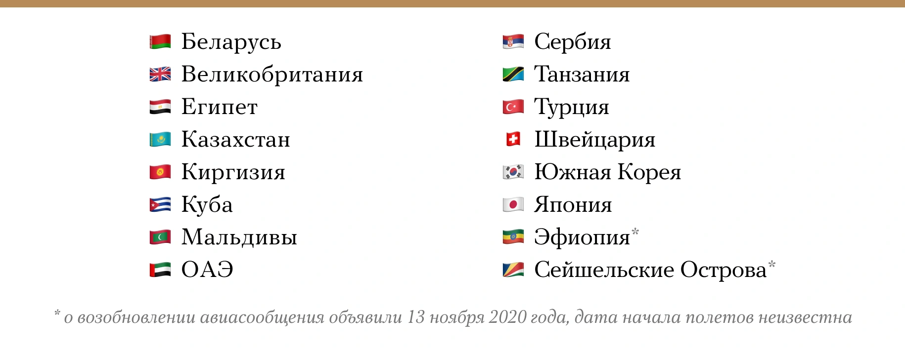 Россия возобновит авиасообщение с Эфиопией и Сейшельскими островами, объявило правительство РФ 13 ноября. Число стран, куда можно улететь из российских городов, таким образом увеличится до 16. В этот список входят только страны, о возобновлении авиасообщения с которыми официально объявляло правительство РФ. Из России выполняются полеты и в другие страны, например «вывозные» или «грузовые» рейсы. Россия в августе начала восстанавливать авиасообщение, приостановленное в марте на фоне пандемии коронавируса. До пандемии из России можно было улететь почти в 190 стран мира.