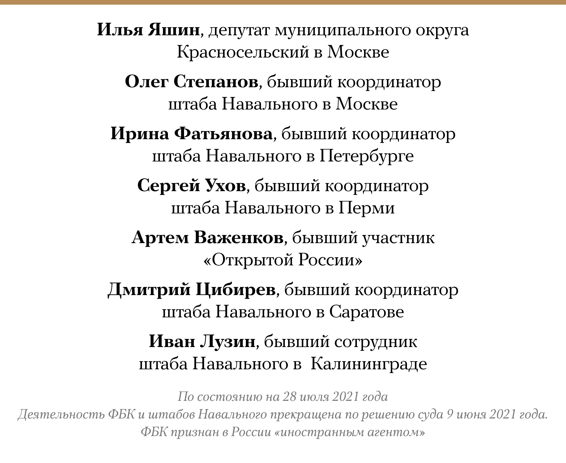 4 июня в России вступил в силу закон, запрещающий участвовать в выборах людям, которые работали в «экстремистских» организациях или помогали им, например, отправляя пожертвования. Принятые Госдумой поправки называют «законом против ФБК», поскольку их рассматривали параллельно с судебным процессом, на котором структуры Алексея Навального, в том числе Фонд борьбы с коррупцией, объявили «экстремистскими» организациями. Российские власти начали исполнять закон в том же месяце — 22 июня до выборов не допустили Олега Степанова, бывшего координатора московского штаба Навального. На следующий месяц «закон против ФБК» стали применять против сторонников Навального в крупных городах России. Деятельность ФБК и штабов Навального прекращена по решению суда 9 июня 2021 года. ФБК признан в России «иностранным агентом». На членов «Открытой России» возбуждены несколько уголовных дел об участии в «нежелательной организации». Причем сама организация этого статуса не имеет, в список «нежелательных» внесены иностранные юридические лица с таким названием.