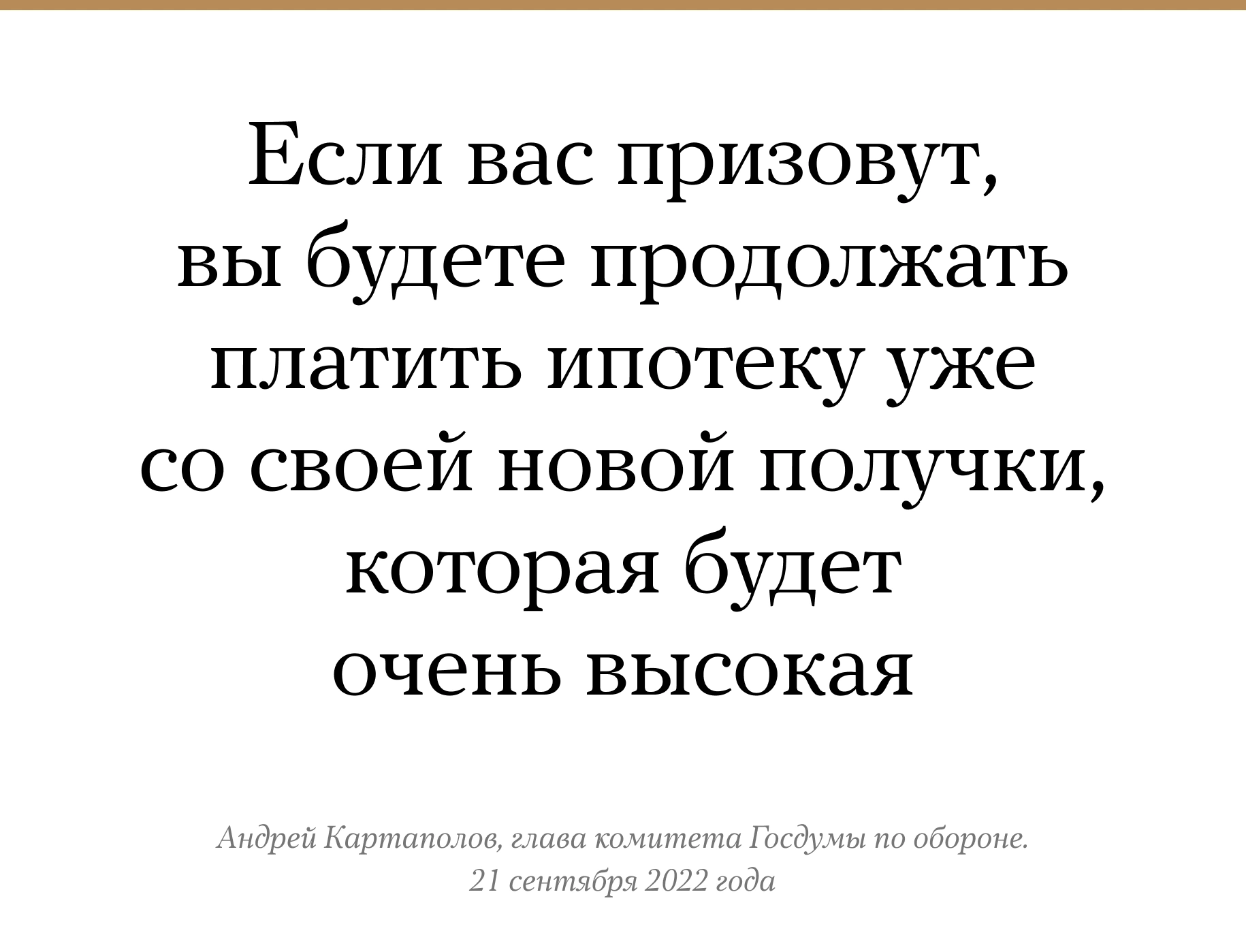 После объявления мобилизации в России у главы комитета Госдумы по обороне, генерал-полковника Андрея Картаполова спросили, как платить по ипотечным кредитам тем, кого призовут в армию. Он заявил, что эти люди будут платить из «новой получки, которая будет очень высокая». На вопрос, что делать, если армейский оклад окажется ниже текущей зарплаты, Картаполов ответил, что у таких людей «есть возможность закрыть ипотеку и так». ЦБ РФ, в свою очередь, рекомендовал банкам и микрофинансовым организациям предоставлять кредитные каникулы, в том числе по ипотеке, мобилизованным гражданам и лицам, находящимся у них на иждивении. Эта рекомендация может быть закреплена в законе, сообщил регулятор.