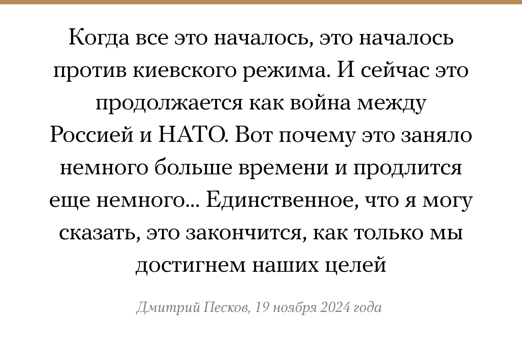 Пресс-секретаря президента РФ Дмитрия Пескова спросили в эфире индийского информагентства ANI, почему так долго продолжается российско-украинская война и когда она завершится. Представитель Кремля заявил, что «специальная военная операция» заняла «немного больше времени», потому что уже превратилась в конфликт России с НАТО. Прогнозировать сроки окончания боевых действий Песков не стал. 19 ноября 2024 года — 1000-й день с момента полномасштабного вторжения российских войск на территорию Украины.