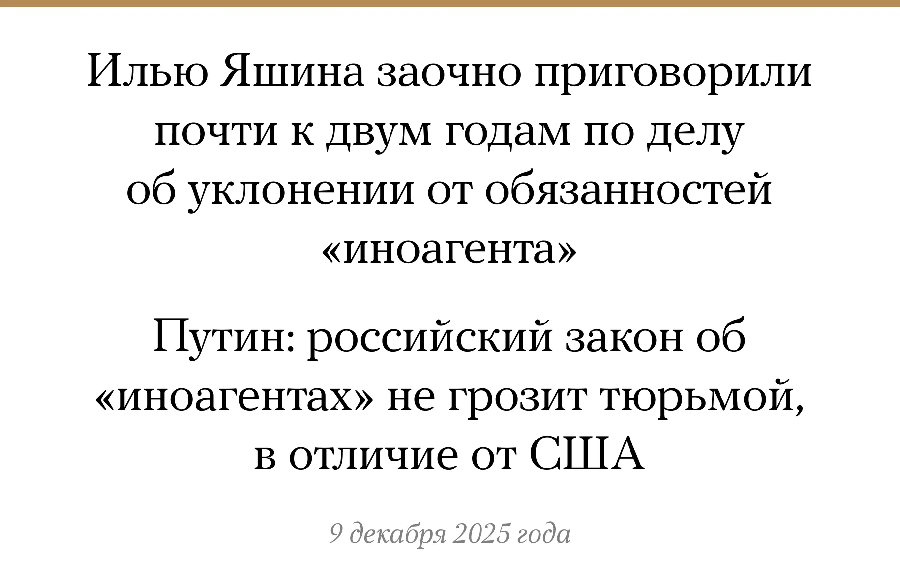 Владимир Путин заявил 9 декабря, что действующий в России закон об «иностранных агентах» мягче, чем аналогичный закон в США. «Там нарушение этого закона грозит тюремным заключением, у нас же нет такого», — сказал президент РФ на заседании Совета по правам человека (СПЧ), комментируя выступление режиссера Александра Сокурова. В этот же день московский суд заочно приговорил политика Илью Яшина к одному году и 10 месяцам лишения свободы по делу об уклонении от обязанностей «иноагента» (статья 330.1 УК). Максимальное наказание по этой статье — два года лишения свободы. Владимир Путин неоднократно подписывал поправки, ужесточающие законодательство об «иноагентах». В том числе, в октябре 2025-го он разрешил возбуждать уголовные дела против «иноагентов» после одного административного штрафа вместо двух.