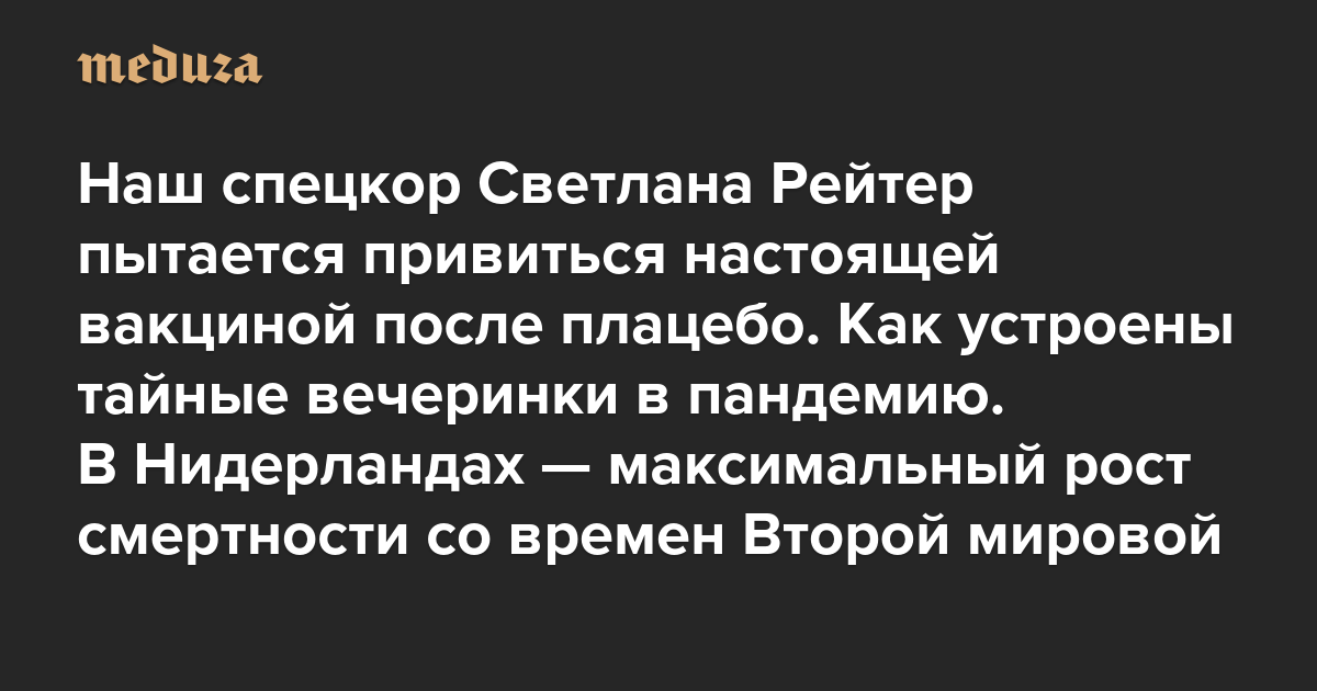 Вечерний Коронавирус Наш спецкор Светлана Рейтер пытается привиться настоящей вакциной после плацебо. Как устроены тайные вечеринки в пандемию. В Нидерландах — максимальный рост смертности со времен Второй мировой
