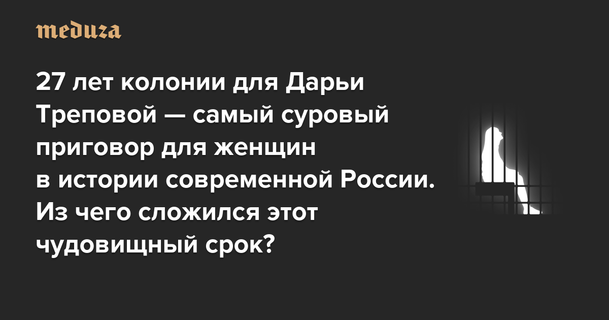 На момент публикации материала «Медузе» не удалось обнаружить «разбивки» срока по этим статьям, но для понимания «арифметики» наказания можно опереться на слова стороны гособвинения в суде. 27 лет лишения свободы — это почти столько же, сколько для Треповой запрашивала прокурор Надежда Тихонова (28 лет).