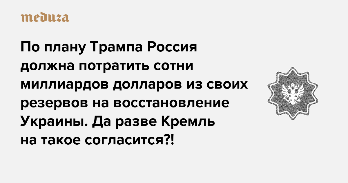 Но есть и более прагматичное объяснение вероятному согласию российских властей. Страны «Большой семерки» еще в 2023 году договорились, что резервы РФ при любых обстоятельствах останутся заморожены до тех пор, пока Украина не получит компенсацию за нанесенный ей ущерб. И даже военная победа никак не повлияет на судьбу активов. А новый план Вашингтона может стать компромиссом для всех участников переговорного процесса, включая Москву, объясняет «Медузе» научный сотрудник Центра анализа европейской политики (CEPA) Александр Коляндр. С точки зрения РФ, «это лучше, чем то, что есть сейчас»: варианта возврата всех активов у Кремля нет, а в предложении Трампа у российской стороны появляется шанс получить обратно хотя бы часть средств, резюмирует эксперт.