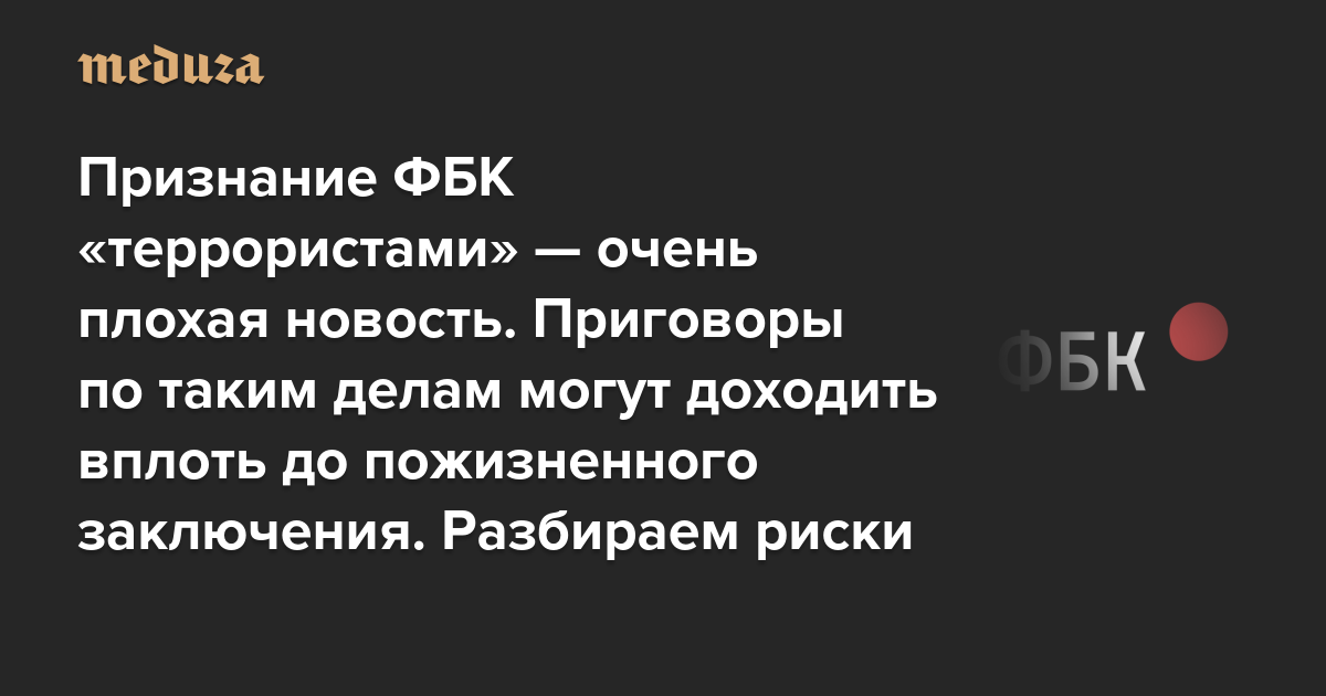 Признание ФБК «террористами» — очень плохая новость. Приговоры по таким делам могут доходить вплоть до пожизненного заключения Кто из членов ФБК в наибольшей опасности? И что грозит донатерам фонда?