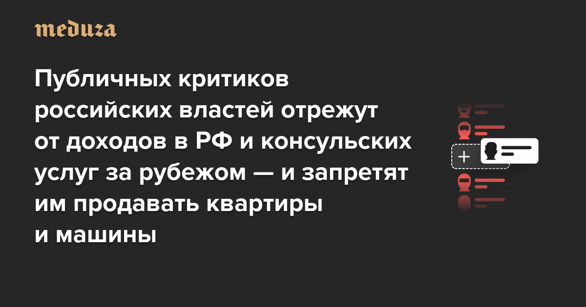 Публичных критиков российских властей отрежут от доходов в РФ и консульских услуг за рубежом — и запретят им продавать квартиры и машины Все это прописано в будущем законе о новом реестре врагов государства. Что важно о нем знать?