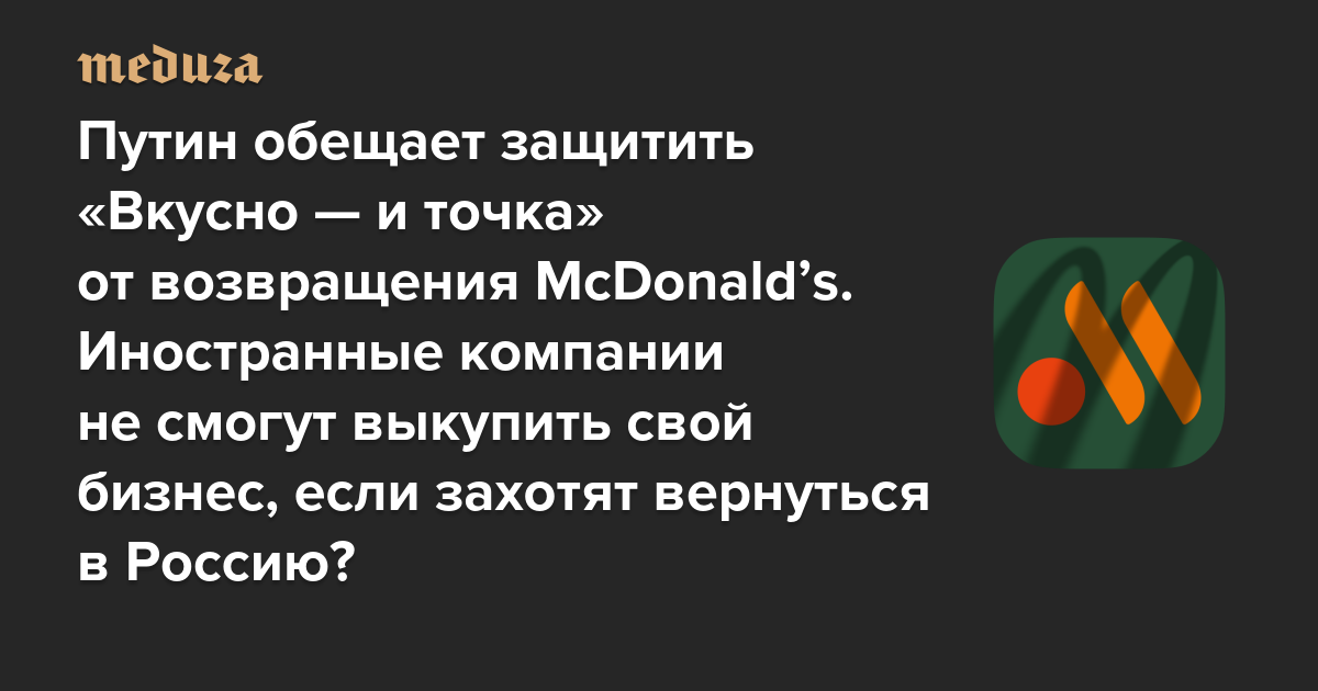 Путин обещает защитить «Вкусно — и точка» от возвращения McDonaldʼs. Иностранные компании не смогут выкупить свой бизнес, если захотят вернуться в Россию? Скорее всего. Для этого в Госдуме полностью подменили текст законопроекта, который уже прошел первое чтение