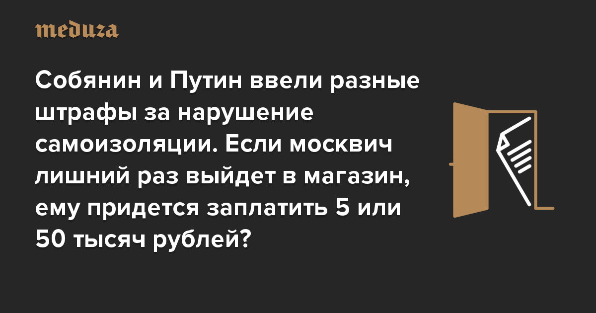 Собянин и Путин ввели разные штрафы за нарушение самоизоляции. Если москвич лишний раз выйдет в магазин, ему придется заплатить 5 или 50 тысяч рублей?