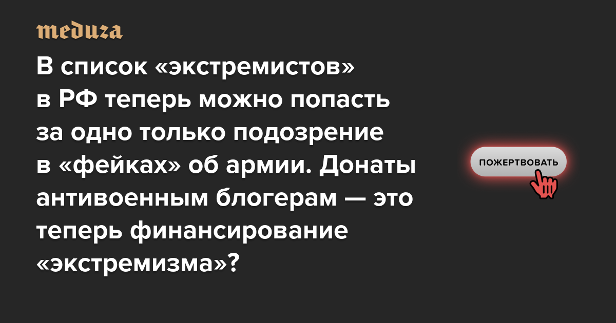 В список «экстремистов и террористов» в РФ теперь можно попасть за одно только подозрение в «фейках» об армии. Донаты антивоенным блогерам — это теперь тоже финансирование «экстремизма»? Памятка о рисках пожертвований из России