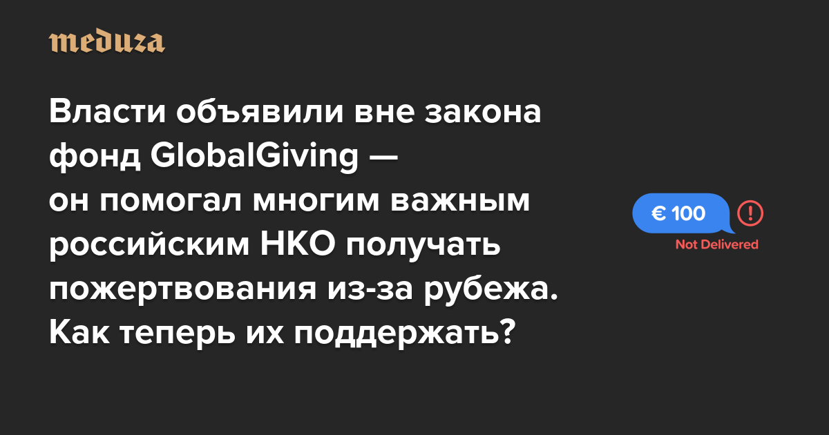 Именно поэтому «Медуза», также объявленная в России «нежелательной» организацией, не принимает пожертвования в рублях и просит тех, кто поддерживает редакцию, соблюдать правила безопасности. Впрочем, рубли нельзя перевести и GlobalGiving.