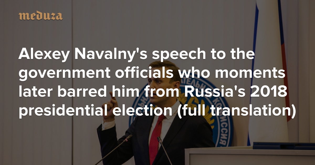 Russia’s Central Election Commission refused to register Alexey Navalny’s presidential candidacy on December 25, a day after the opposition politician’s campaign staged nomination gatherings in 20 cities across the country and Navalny personally submitted his candidacy application to the commission. Before the formal vote, Navalny addressed the commission in a fiery speech where he called on election officials to let him compete in the March 2018 presidential race. Meduza presents an English translation of Navalny’s remarks.